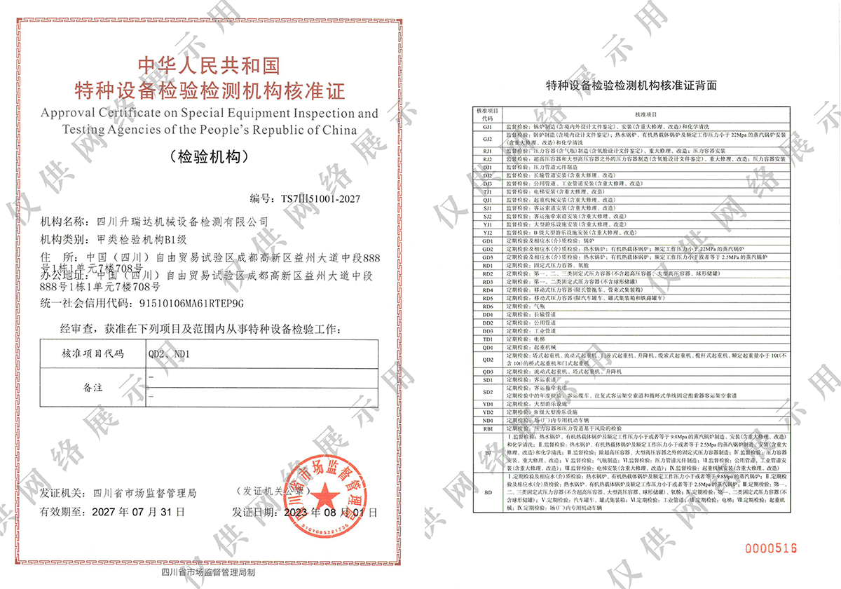 熱烈祝賀四川升瑞達機械設備檢測有限公司成功取得特種設備檢驗檢測機構核準證-甲類檢驗機構B1級證書。