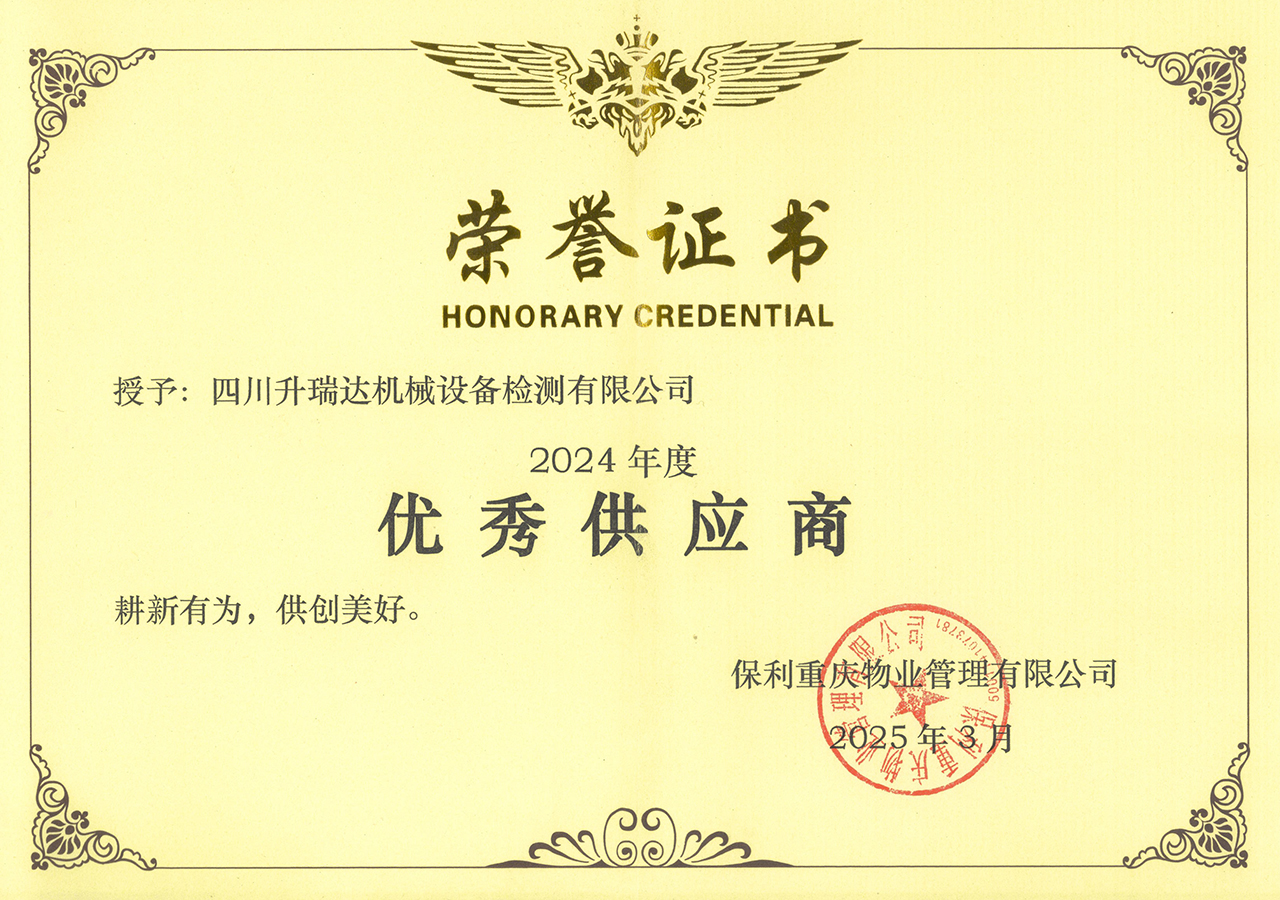 ? ? ? ?保利重慶物業(yè)管理有限公司正式授予四川升瑞達機械設備檢測有限公司 “優(yōu)秀供應商” 殊榮。這一榮譽,不僅是對我們過往不懈努力的高度認可,更是開啟我們邁向更高征程的全新起點。