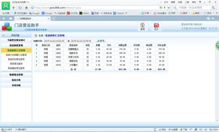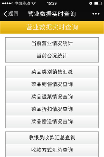 銷(xiāo)售報(bào)表:菜品類(lèi)別銷(xiāo)售匯總、菜品銷(xiāo)售情況、退菜查詢(xún)、折扣查詢(xún)、贈(zèng)送查詢(xún)