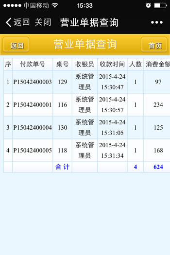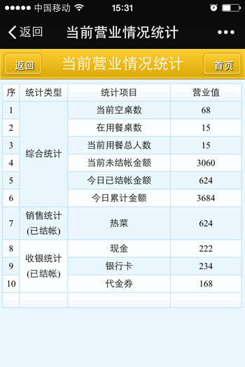 報(bào)表分析:日營(yíng)業(yè)情況統(tǒng)計(jì)、日營(yíng)業(yè)毛利分析、菜品銷(xiāo)售排行榜、營(yíng)業(yè)單據(jù)查詢(xún)、開(kāi)臺(tái)情況查詢(xún)